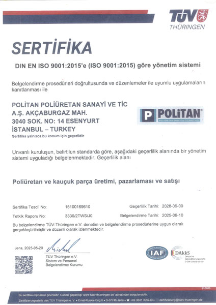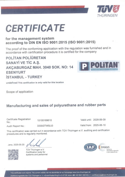 Kalitenin önemini bilen POLİTAN 2007 yılından beri ISO 9001 Kalite Yönetim Sistemi'ni uygulamaktadır. Müşteri isteklerinde ve ilgili standartlarda talep edilen şartların ve spesifikasyonların eksiksiz ve zamanında sağlanmasını güvence altına alınmasını ve sürekli iyileştirimelerin gerçekleştirilmesini amaçlayan firmamız, memnuniyeti ve hizmet kalitesini ön planda tutan ISO 9001:2015 Kalite Yönetim Sistemi Belgelendirme Sertifikası'na sahiptir.